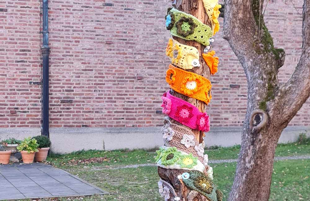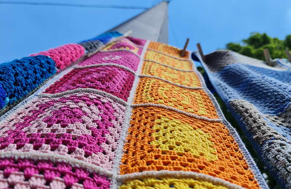 Zwischen den Maschen blühen gehäkelte Blumen – fragile Zeichen von Fürsorge, Verletzlichkeit und Lebenswillen.